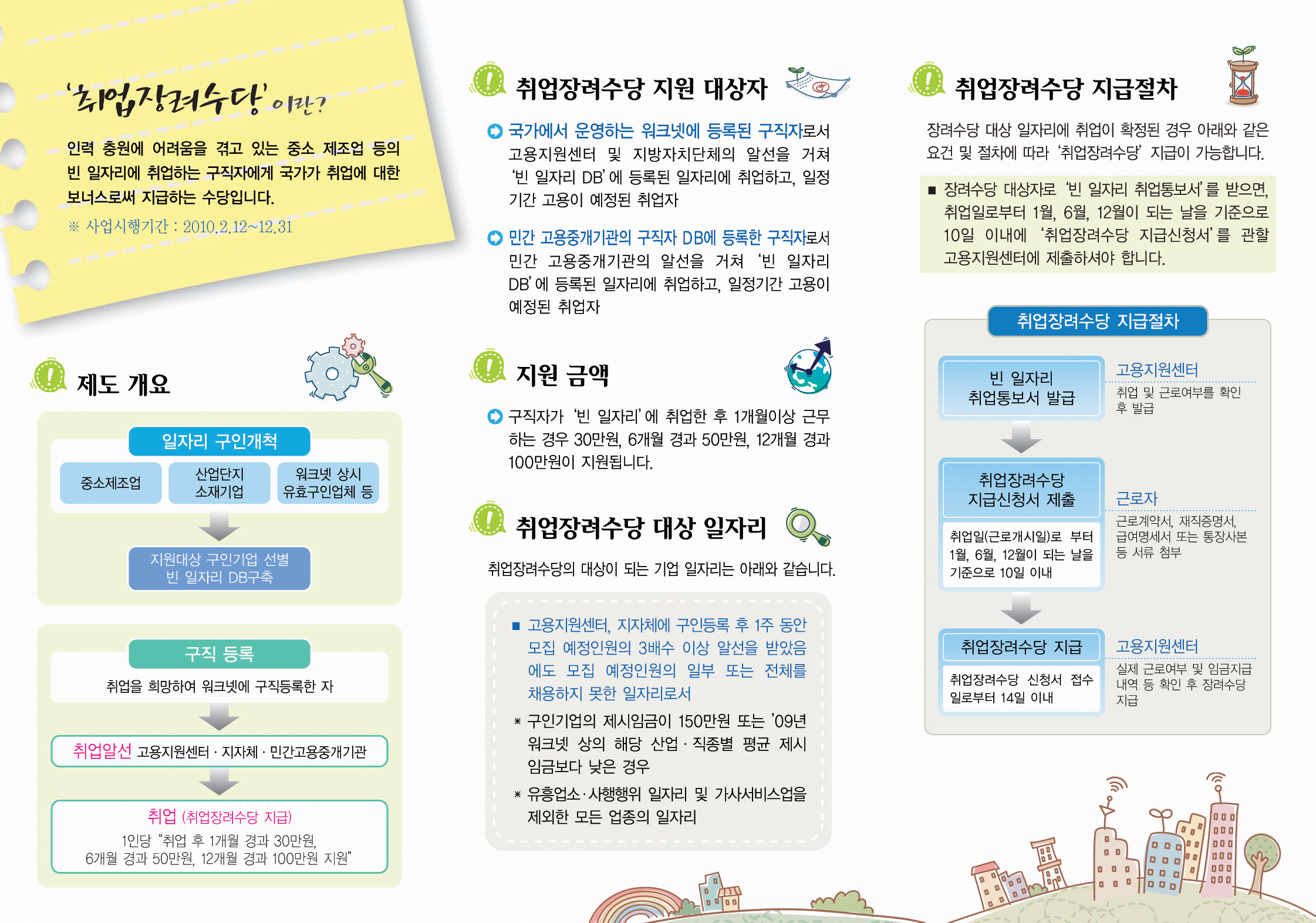 4. 장려수당 지원가능 대상 구직자 - 노동부 워크넷 구직등록 유효 구직자(구직등록 기간 무관) * 학생의 경우 재학생?휴학생은 빈 일자리 취업시에도 장려수당 지급 불가 5. 빈 일자리 취업장려수당 관련 신청방법 □ 구인업체 절차 ① 노동부 work-net(http://www.work.go.kr) 접속하여 기업회원 가입 후 구인신청 또는 - 붙임의『구인표』를 작성하여 대구지방고용노동청 대구고용센터 취업지원과로 팩스 송부(Fax (053)720-4010) ② 구인인증(관할센터 또는 대구센터)이 완료되면 워크넷에 구직등록 되어 있는 적합 구직자를 알선 받거나 또는 적합 구직자 알선요청(관할센터 또는 대구센터 ☎053-667-6172) ③ 적합자 채용 후 결과통보 □ 구직자 절차 ① 노동부 work-net(http://www.work.go.kr) 접속하여 개인가입 후 구직신청 또는 ② 구직인증(관할센터)이 완료되면 워크넷에 구인등록 되어 있는 희망 구인업체를 알선 받기(대구고용센터 ☎053-667-6172,6166) ③ 알선 이후 출근 전날 알선 받은 대구고용센터로 취업신고 6. 취업장려수당 지급 유의사항 □ 지급요건 고용센터, 지자체 등의 알선을 받아 지원대상 기업(일자리)에 근로계약기간이 3개월 이상이고, 근로기준법에 의한 소정 주당 근로시간이 30시간 이상인 일자리에 취업하여 근무하는 경우 ※ 금년 12월까지 한시 사업으로 운영되고 있으며 ‘10.12.31까지의 취업자에 대해서는 2011년에도 계속 취업장려수당이 지급됩니다. □ 지급 방법 (근로자 직접 신청)임금 지급일과 관계없이, 취업일(근로개시일)로부터 1개월, 6개월, 12개월이 되는 날을 기준으로 10일 이내에 취업장려수당 신청서를 관할 고용지원센터에 제출 □ 지급 시기 및 금액 취업장려수당은 1개월 이상 근무하는 경우, 임금지급일과 관계없이 취업일(근로개시일)로부터 - 1개월이 되는 날을 기준으로 30만원, 6개월이 되는 날을 기준으로 50만원, 12개월이 되는 날을 기준으로 100만원 지급하여 1인당 최대 180만원 지급 가능 * 취업일(근로개시일)로부터 1개월 미만 근로시에는 취업장려수당 부지급 * 취업장려수당 1회 이상 지급받은 이후, 중도탈락한 경우에는 다음 회차의 취업장려수당 부지급 - 장려수당은 구직자 1인에 대해 1회에 한해 지원 □ 지급 절차 - 취업장려수당 지급신청서 제출일로부터 14일 이내에 지급 ☎ 문의처 : 대구고용센터 취업지원과 ☎ 053-667-6172, 6166